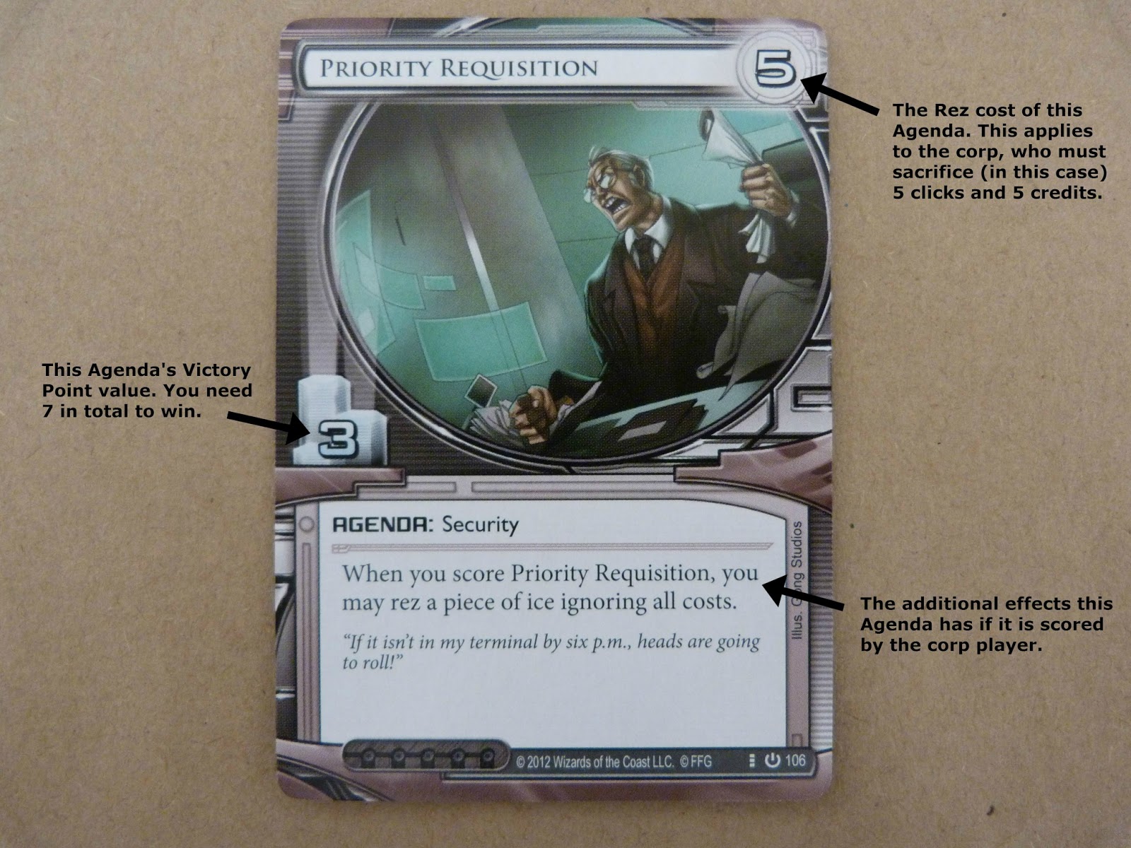 The corp player wins agendas by placing them face down into a remote server and advancing them by the number of advancement tokens required (see agenda image). Each advancement token costs one credit and one click (action point) to place. You represent advancement tokens by placing a credit token on the card you are advancing, white side up. Once you hit the required number of advancement tokens, you can rez the agenda, take the actions described on its face, and move it to your score area.So other than agendas...