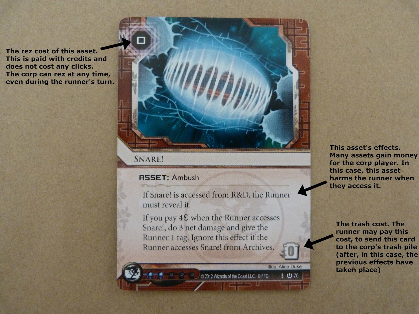Often times, you will want a card to remain unrezzed for a long time, if it has no benefit to you, such as the following example of a Snare. The corp should leave it unrezzed and then rez it when the runner gains access to it. In it's unrezzed state, it may appear to be an agenda from the runner's perspective, but when the runner access it, rather than scoring, they will suffer net damage (damage is explained in the final section).